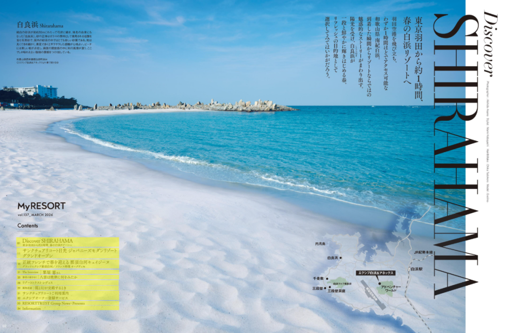 特集「Discover SHIRAHAMA 東京から約1時間、春の白浜リゾートへ」では、エクシブ白浜&アネックスから車で約10分のところにある「白良浜」の絶景から幕を開けます。想像以上の絶景や美食に癒やされ時間を忘れて過ごす、白浜ならではのリゾート体験をご提案します。