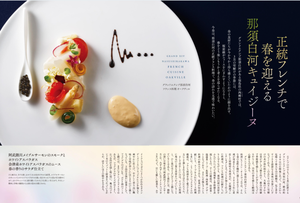 料理のページでは、グランドエクシブ那須白河のフランス料理 オークヴィルのディナーコース「Fleur(フルール)」をご紹介。春の息吹を感じる食材をふんだんに使用し、見た目にも華やかな料理の数々をお楽しみください。